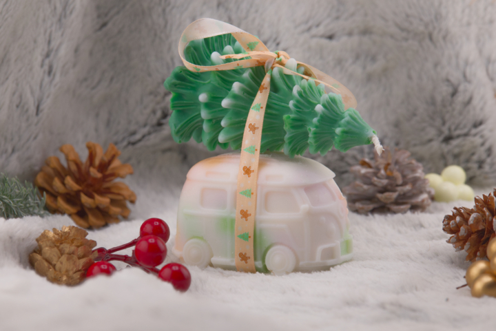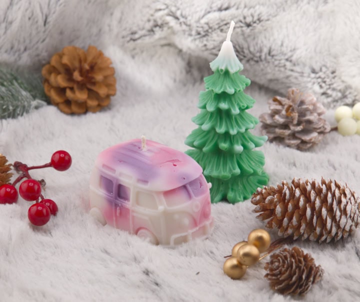 Coffret comprenant une bougie combi VW marbré et une bougie moulée sapin de Noël.